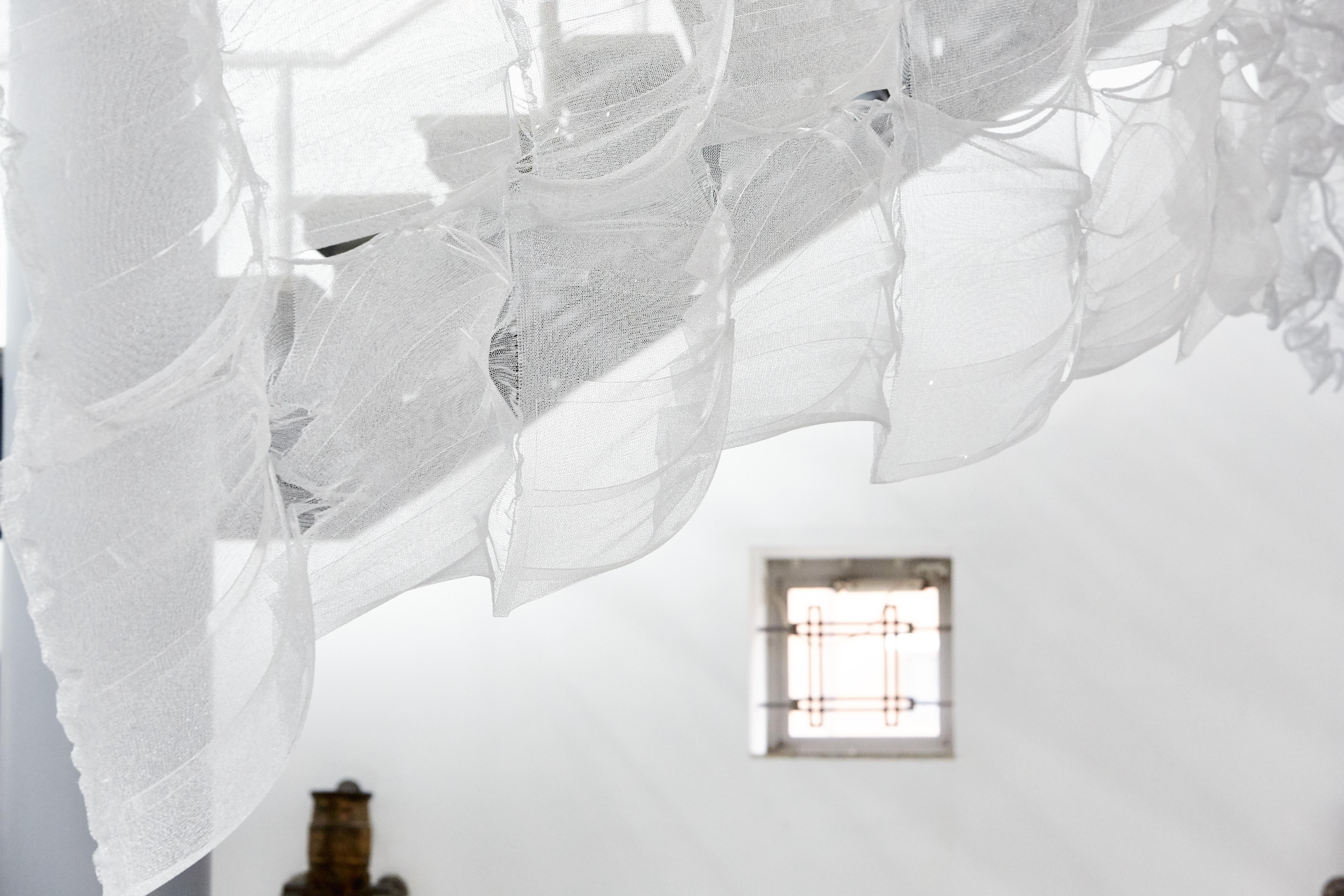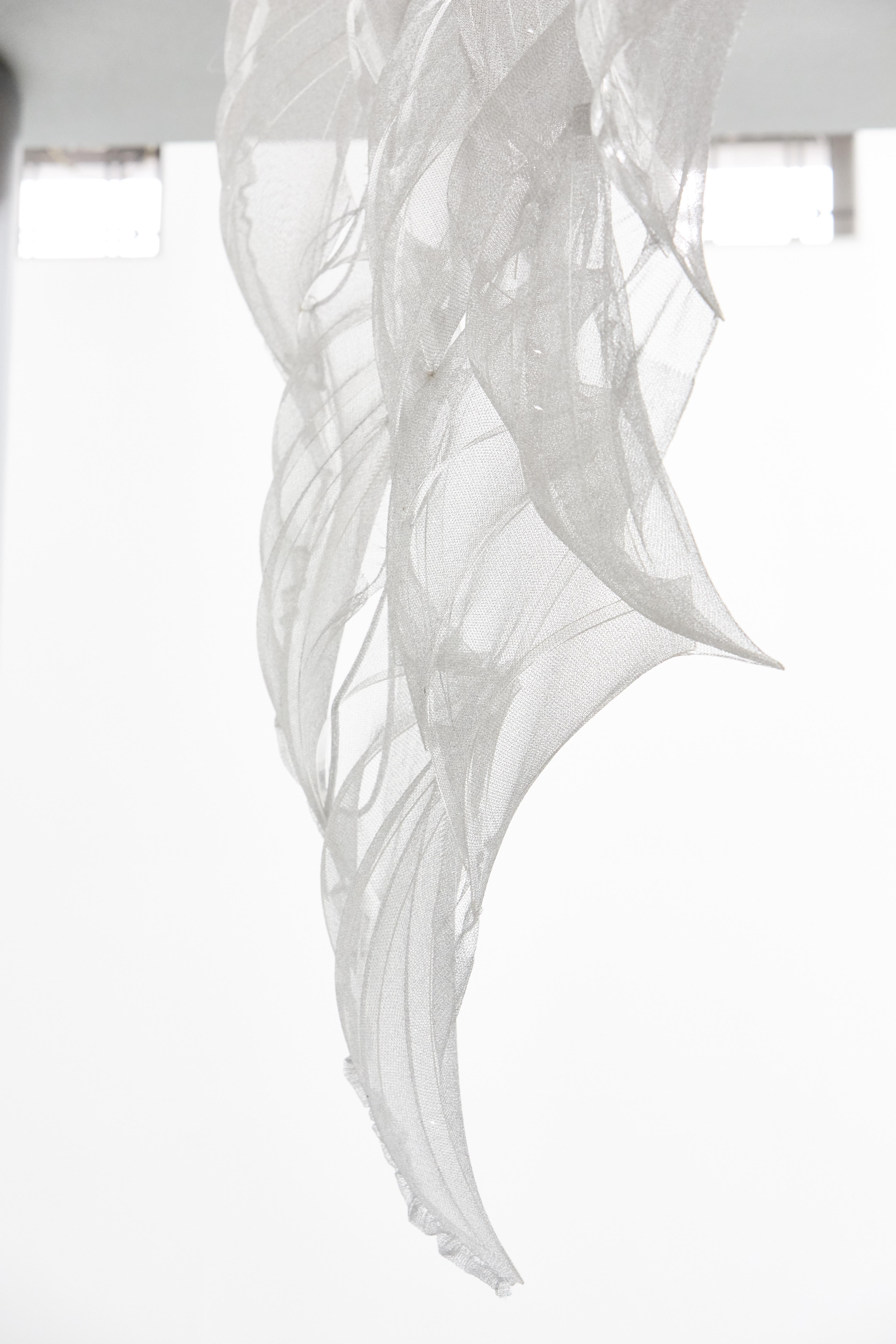 Materials: Nylon monofilament, silver lurex, 2mm acrylic. Programming: Shima Seiki Apex 1. Manufacture: Shima Seiki NSSG5g. Location: The Hall of Steel, The Royal Armouries, Leeds, 2017.